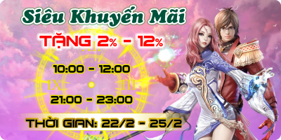 Tháng 2 này, event tại Gamecard.vn sẽ trở nên hấp dẫn hơn bao giờ hết với sự kết hợp của cả 2 event quen thuộc là giờ vàng và cộng dồn đủ mức trong event “Siêu Khuyến Mãi - Tặng 2% - 12%”